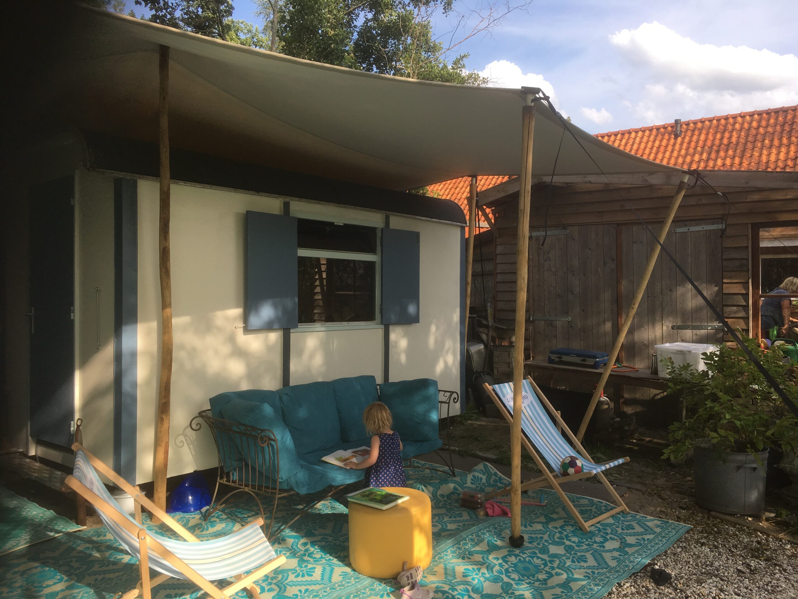 De kleine blauwe pipo staat midden in het groen met zijn kont naar het kampeerterrein, daardoor heeft u veel privacy. Er is een overdekt terras op het zuidwesten, u kijkt uit over de polder en kunt genieten van de zonsondergang.